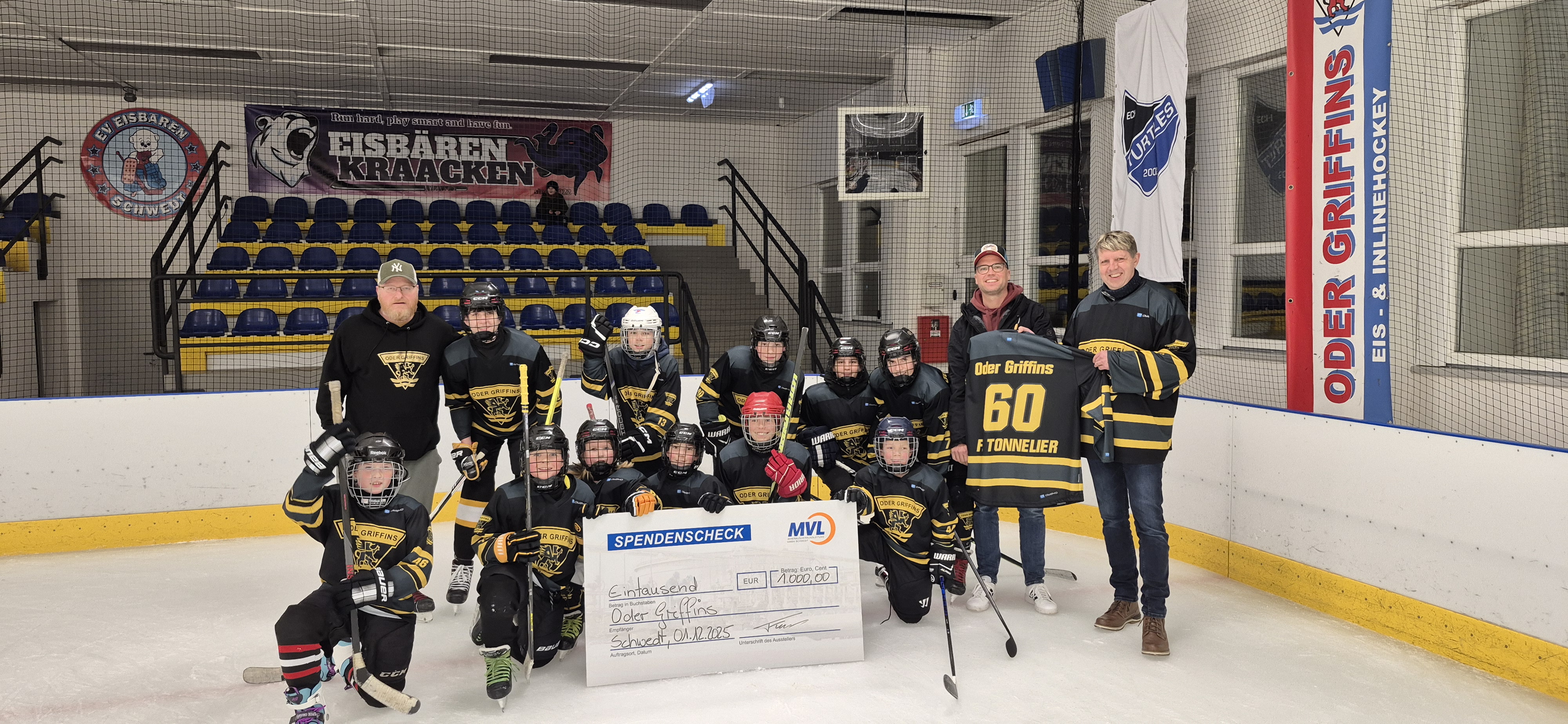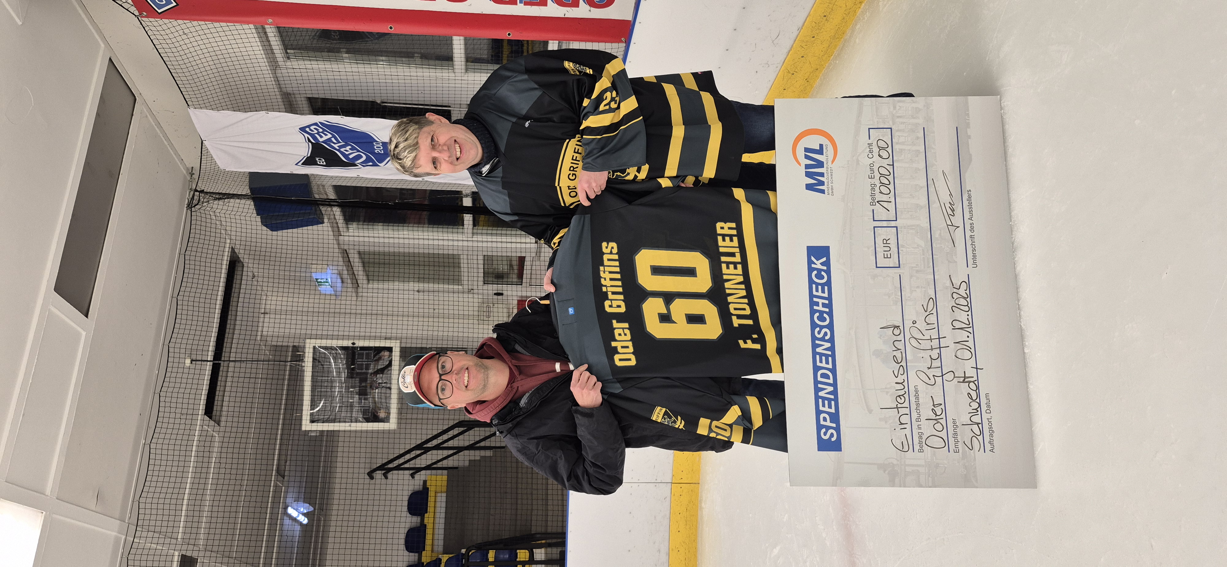 Am Montag, den 5.12., überreichte der Geschäftsführer Fabrice Tonnelier einen 1.000 Euro-Spendenscheck an das hoch ambitionierte Eishockey-Team der Oder Griffins. Die Freude in der Eishalle war riesengroß und nicht zu überhören.